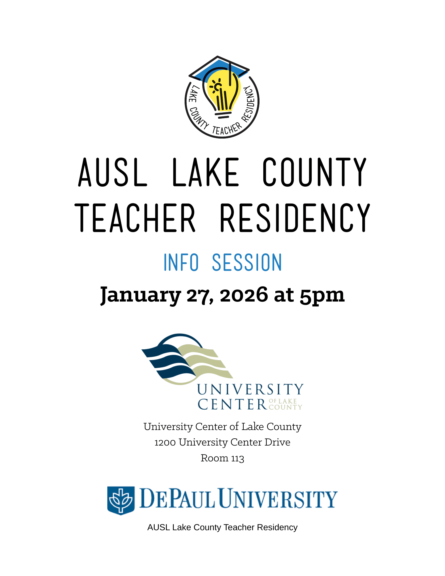 Learn more about AUSL’s Lake County Teacher Residency Program during our information session on Tuesday, January 27, 2025 at 5:00 PM at University Center of Lake County, 1200 University Center Drive, Room 113.