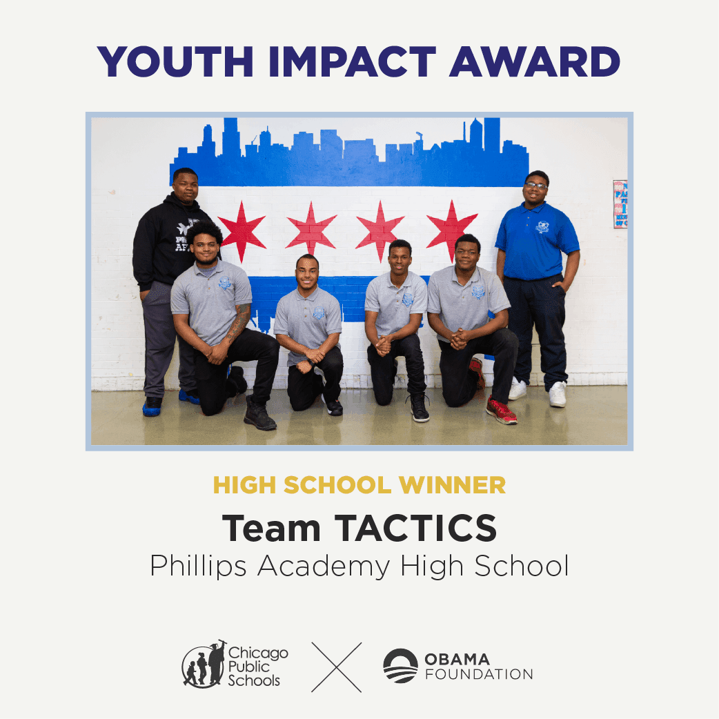 Team TACTICS was awarded a Youth Impact Award from Chicago Public Schools and the Obama Foundation. The Civic Engagement Awards were meant to recognize school and community groups dedicated to improving civic engagement in their communities and provided $2,000 grants to winners to support their projects. The group was started by students from Phillips Academy High School to addresses school disciplinary practices and is working to strengthen the relationship between the community and law enforcement by developing workshops and a curriculum for the school.