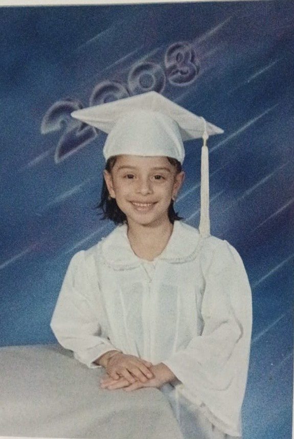 Maria posing for her kindergarten graduation from Nathan S. Davis Elementary School.