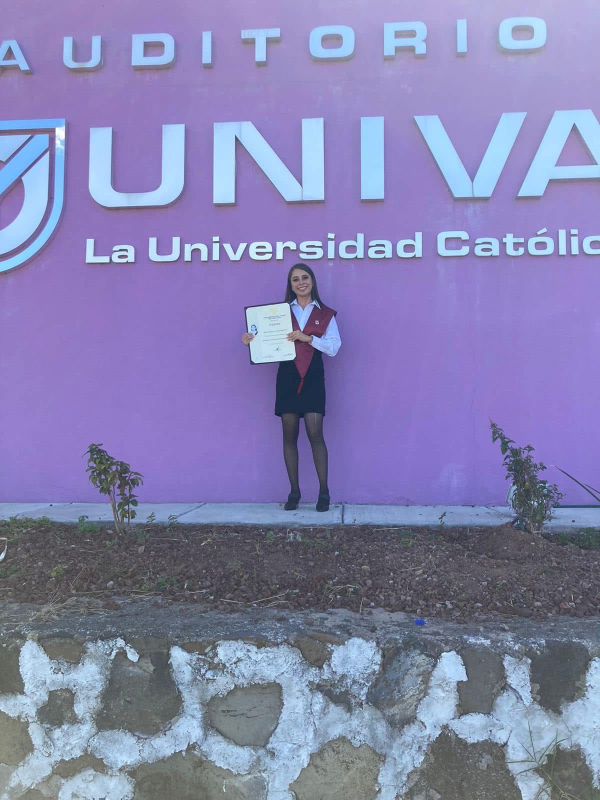 Maria posing in front of her alma mater with her master’s degree in international business.